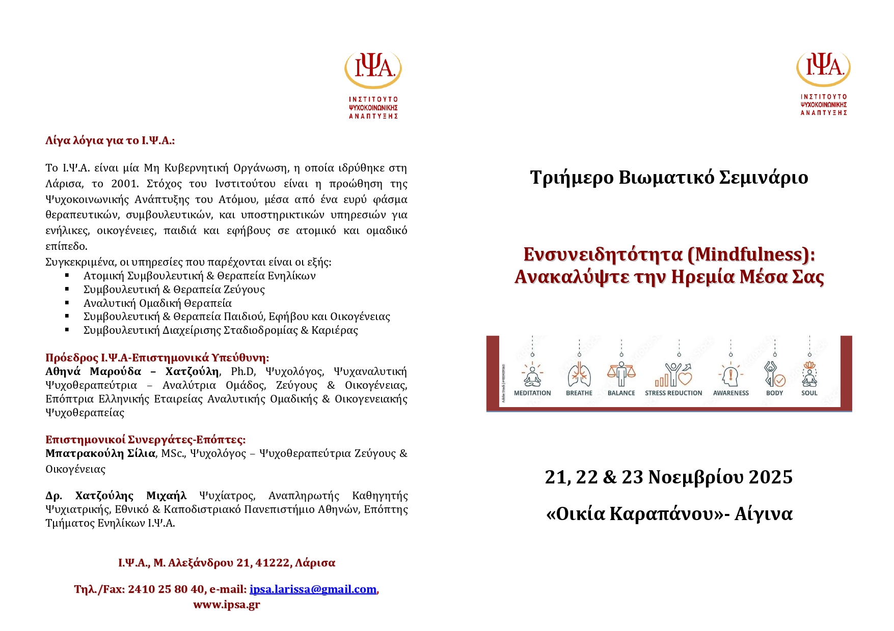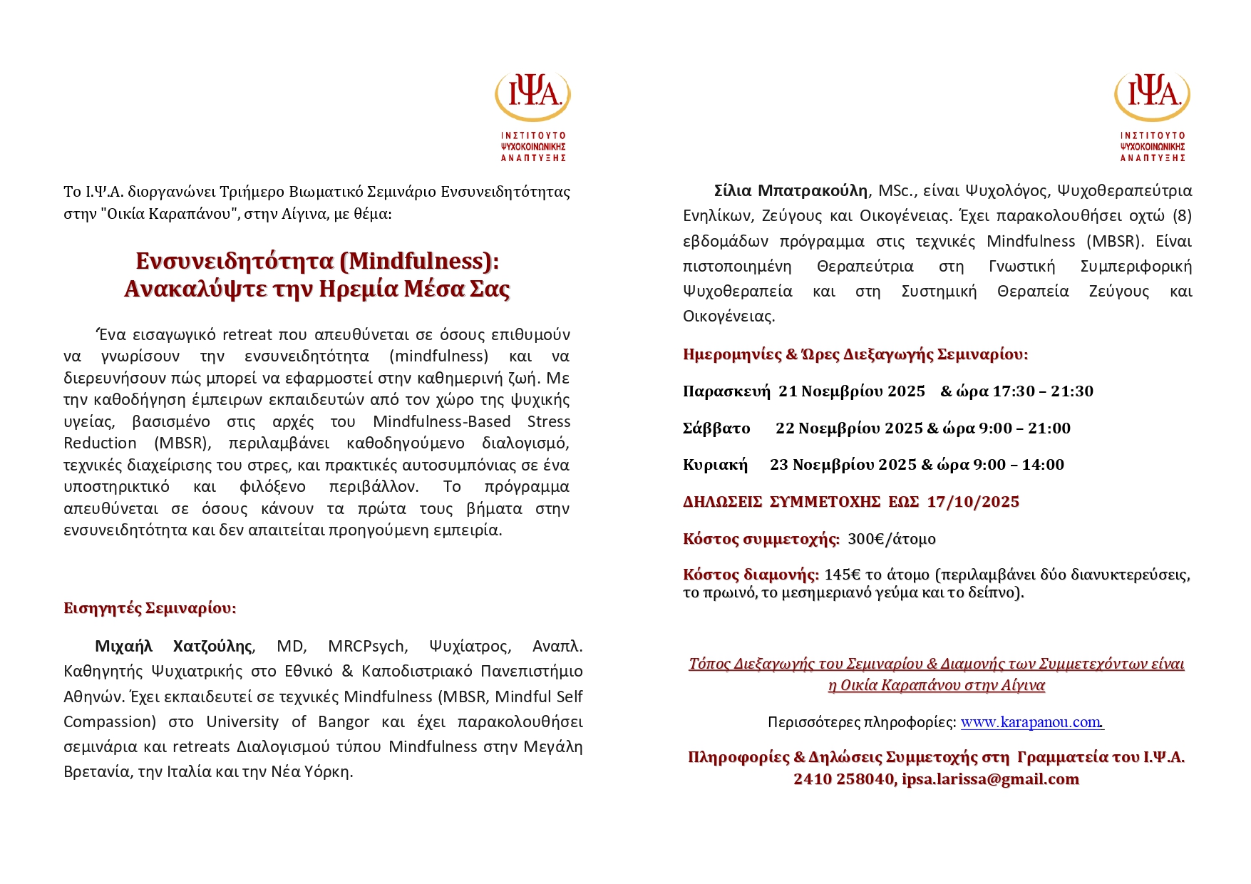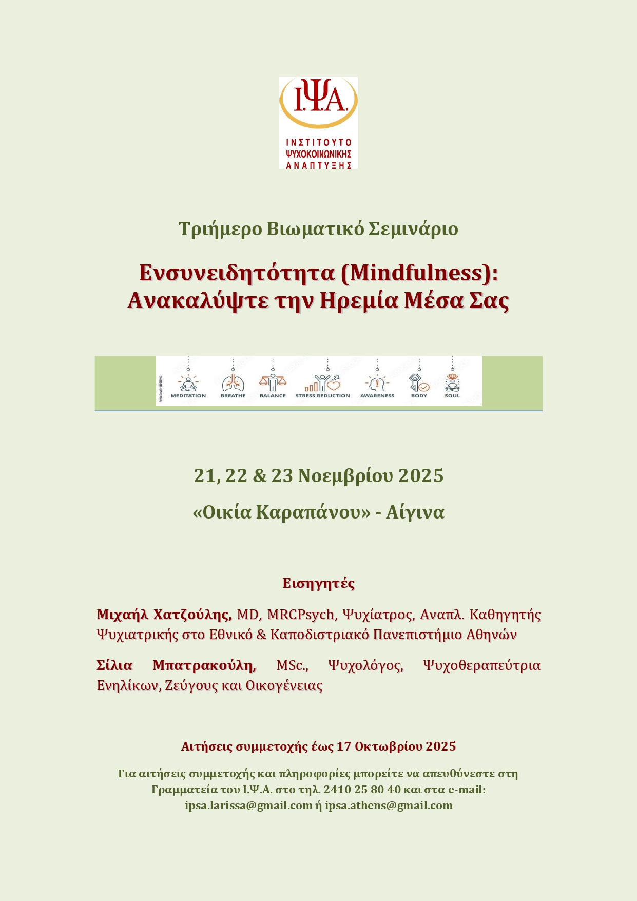 Το Ινστιτούτο Ψυχοκοινωνικής Ανάπτυξης (Ι.Ψ.Α.) διοργανώνει ένα τριήμερο εισαγωγικό retreat με τίτλο «Ενσυνειδητότητα (Mindfulness): Ανακαλύψτε την Ηρεμία Μέσα Σας» στις 21 – 23 Νοεμβρίου 2025 στην «Οικία Καραπάνου», Αίγινα. Απευθύνεται σε όσους επιθυμούν να γνωρίσουν την ενσυνειδητότητα (mindfulness) και να διερευνήσουν πώς μπορεί να εφαρμοστεί στην καθημερινή ζωή. Mε την καθοδήγηση έμπειρων εκπαιδευτών από τον χώρο της ψυχικής υγείας, βασισμένο στις αρχές του Mindfulness-Based Stress Reduction (MBSR), περιλαμβάνει καθοδηγούμενο διαλογισμό, τεχνικές διαχείρισης του στρες, και πρακτικές αυτοσυμπόνιας σε ένα υποστηρικτικό και φιλόξενο περιβάλλον. Το πρόγραμμα απευθύνεται σε όσους κάνουν τα πρώτα τους βήματα στην ενσυνειδητότητα και δεν απαιτείται προηγούμενη εμπειρία.