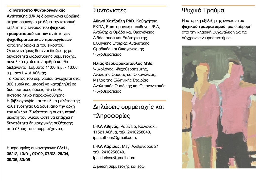 Το Ινστιτούτο Ψυχοκοινωνικής Ανάπτυξης (Ι.Ψ.Α) διοργανώνει υβριδικό ετήσιο σεμινάριο με θέμα την ιστορική εξέλιξη της έννοιας του ψυχικού τραυματισμού και των αντίστοιχων ψυχοθεραπευτικών προσεγγίσεων κατά την διάρκεια του εικοστού.