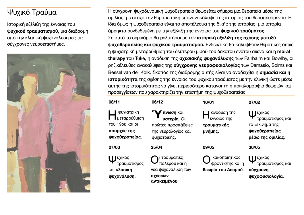 H σύγχρονη ψυχοδυναμική ψυχοθεραπεία θεωρείται σήμερα μια θεραπεία μέσω της ομιλίας, με στόχο την θεραπευτική επανανακάλυψη της ιστορίας του θεραπευόμενου. Η ίδια όμως η ψυχοθεραπεία είναι το αποτέλεσμα της δικής της ιστορίας, μια ιστορία άρρηκτα συνδεδεμένη με την εξέλιξη της έννοιας του ψυχικού τραύματος. Σε αυτό το σεμινάριο θα μελετήσουμε την ιστορική εξέλιξη της σχέσης μεταξύ ψυχοθεραπείας και ψυχικού τραυματισμού. Ενδεικτικά θα καλυφθούν θεματικές όπως η ψυχιατρική μεταρρύθμιση του δεύτερου μισού του δεκάτου ενάτου αιώνα και η moral therapy του Tuke, η ανάδυση της σχεσιακής ψυχανάλυσης των Fairbairn και Bowlby, οι ρηξικέλευθες ανακαλύψεις της σύγχρονης νευροφυσιολογίας των Damasio, Solms και Bessel van der Kolk.